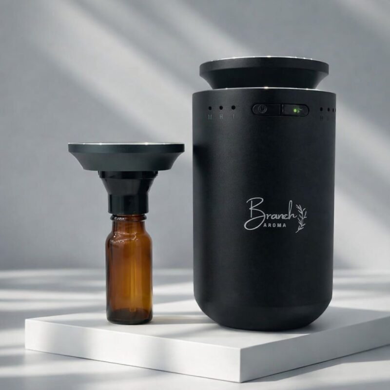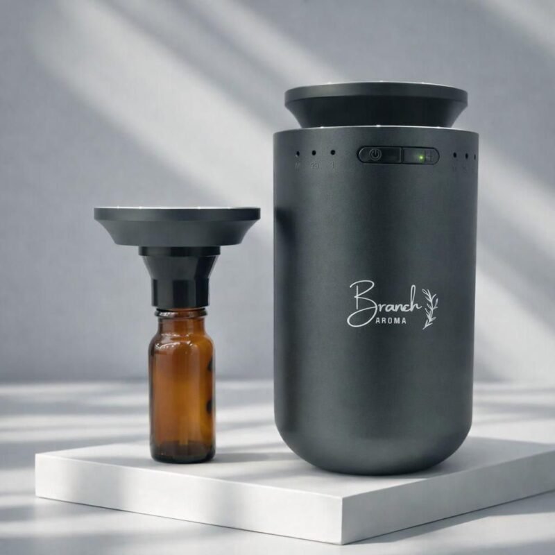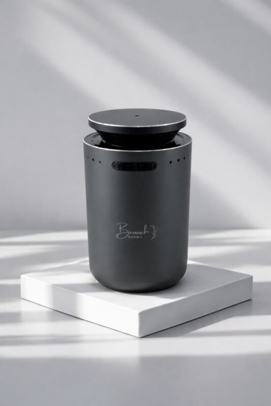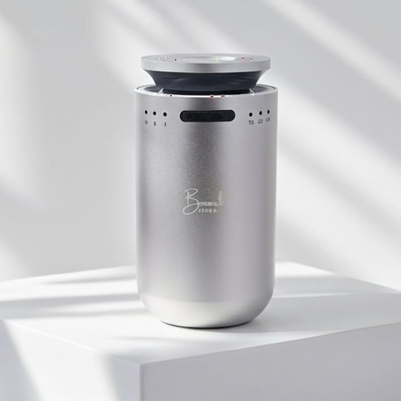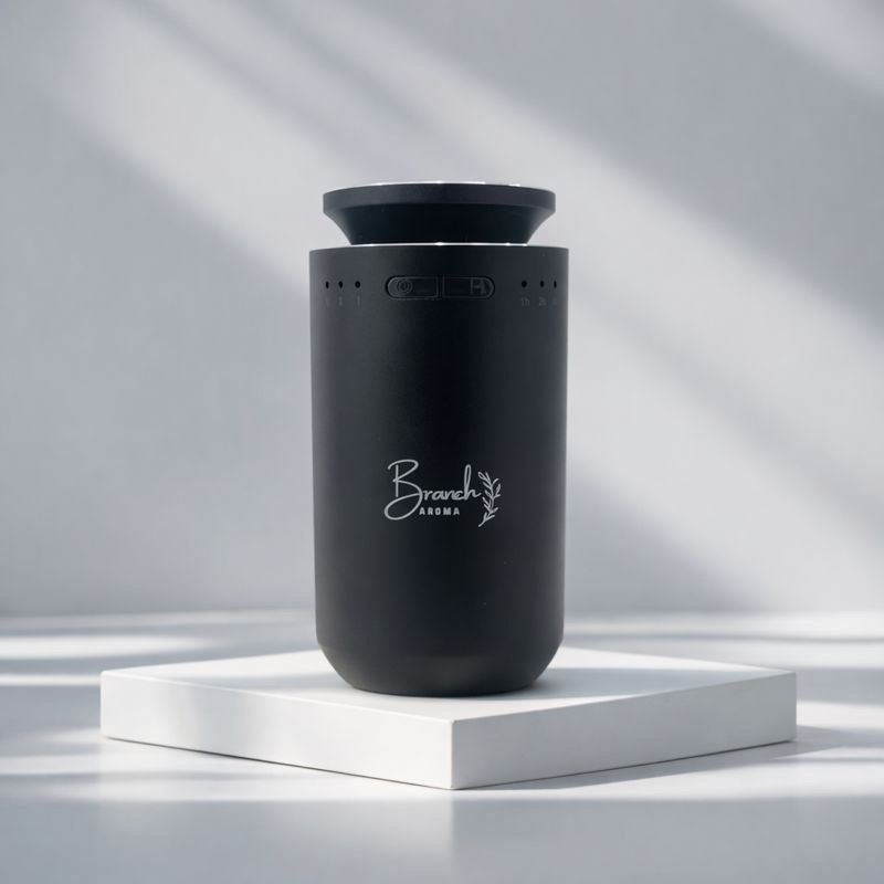 معطر ذكي صغير بتصميم ألمنيوم أنيق، تحكم بثلاثة مستويات للرائحة، مثالي للسيارة والغرف الصغيرة.