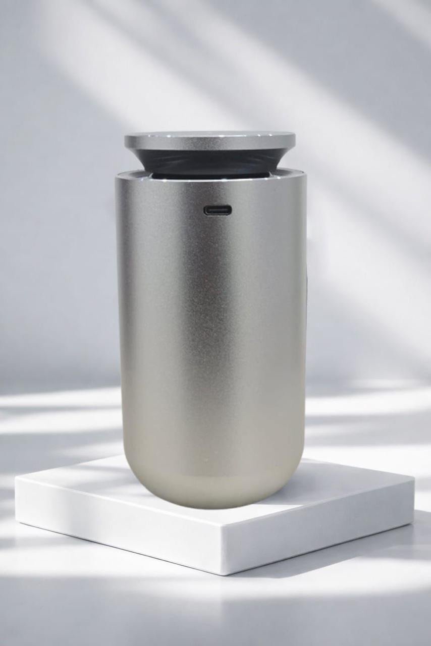 معطر ذكي صغير بتصميم ألمنيوم أنيق، تحكم بثلاثة مستويات للرائحة، مثالي للسيارة والغرف الصغيرة.