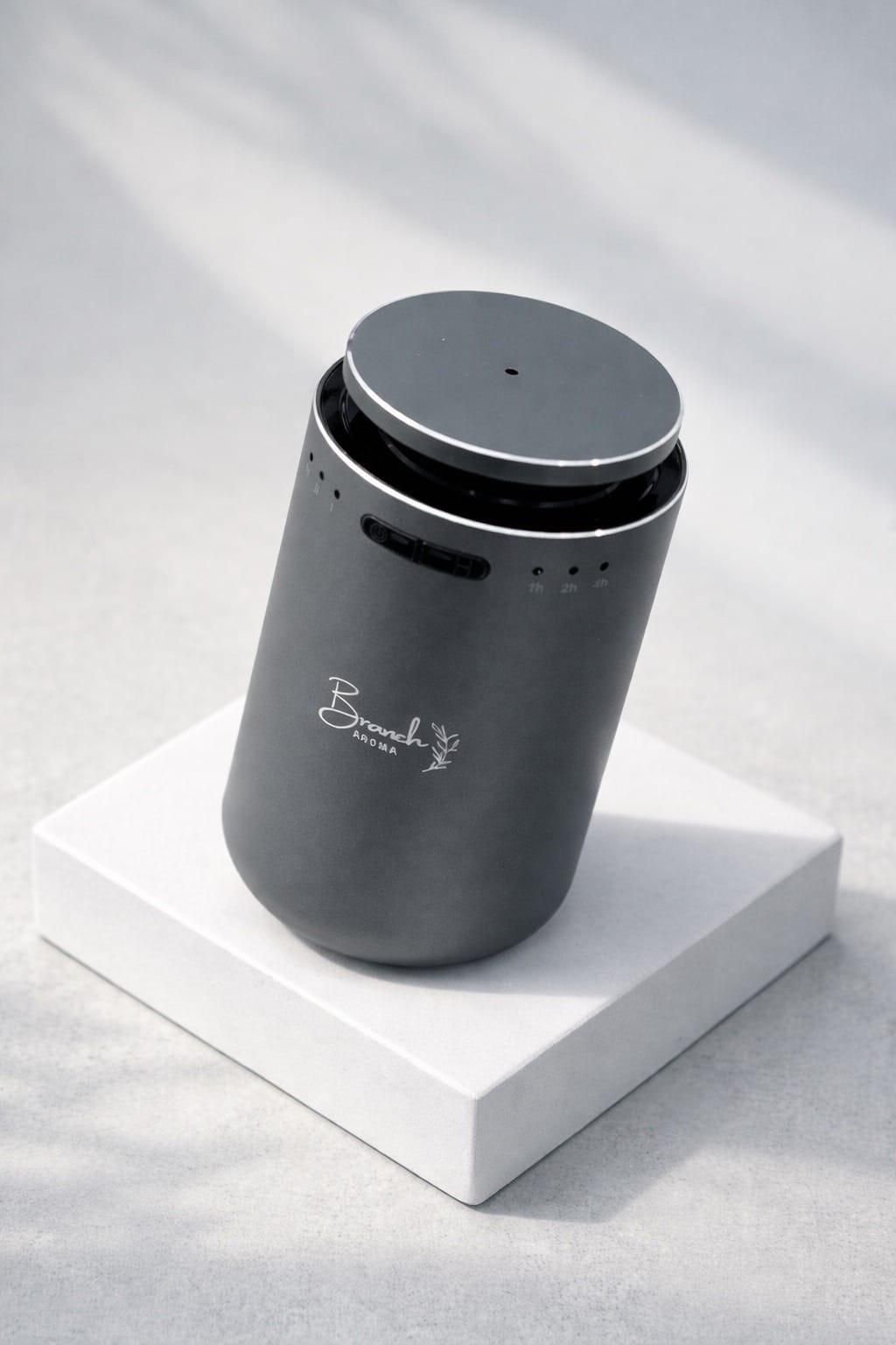 معطر ذكي صغير بتصميم ألمنيوم أنيق، تحكم بثلاثة مستويات للرائحة، مثالي للسيارة والغرف الصغيرة.
