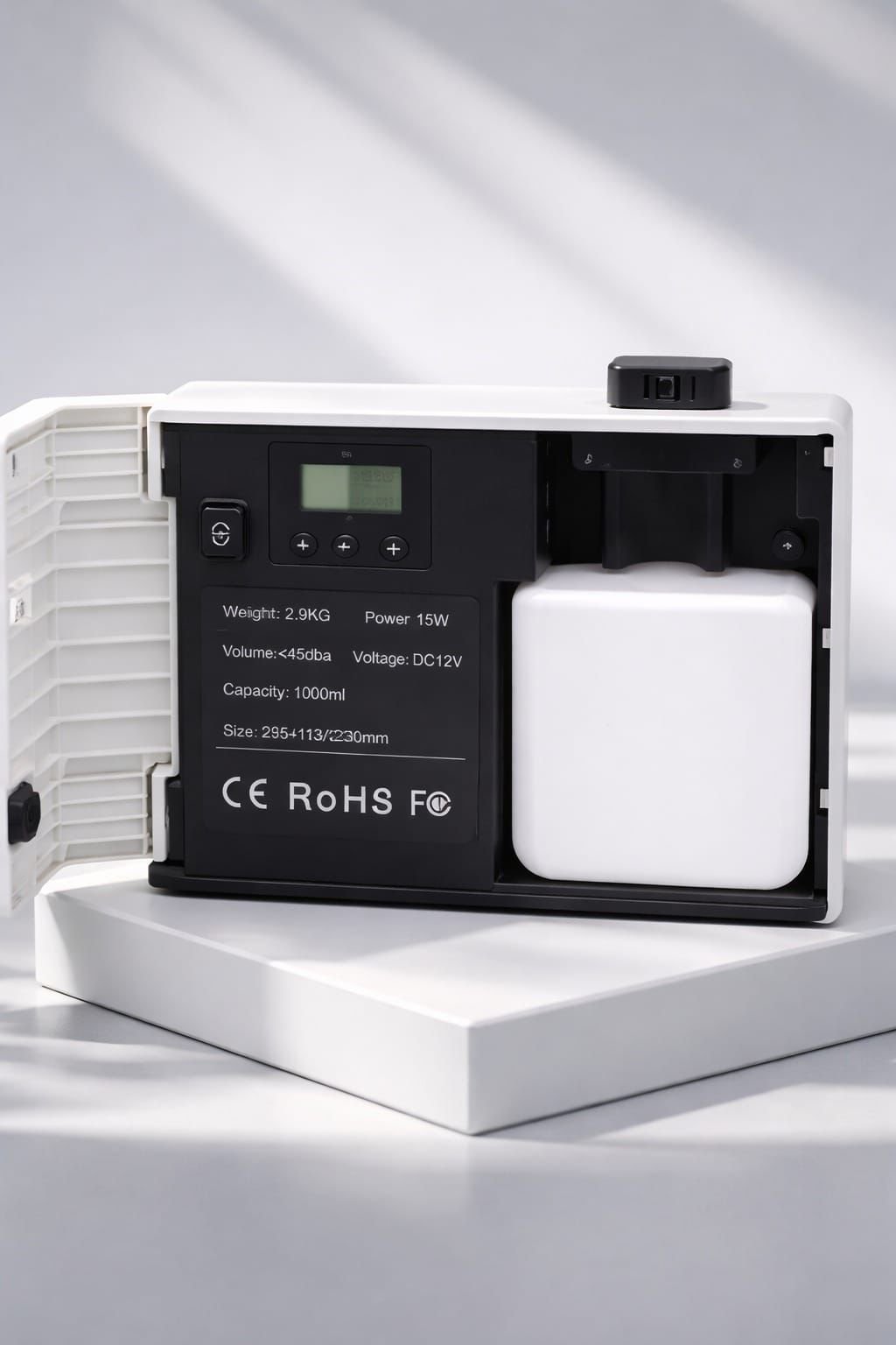 جهاز OV-100 هو الحل المثالي لتعطير المساحات الكبيرة بكفاءة وأناقة. يتميز بتصميم أبيض عصري وتقنيات تشغيل ذكية تضمن توزيع العطر بشكل متوازن ومستمر دون إزعاج.